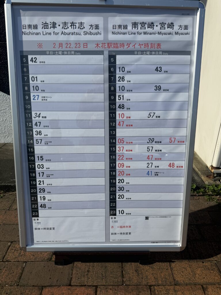 木花駅に降りると臨時ダイヤ時刻表が掲出されていました。