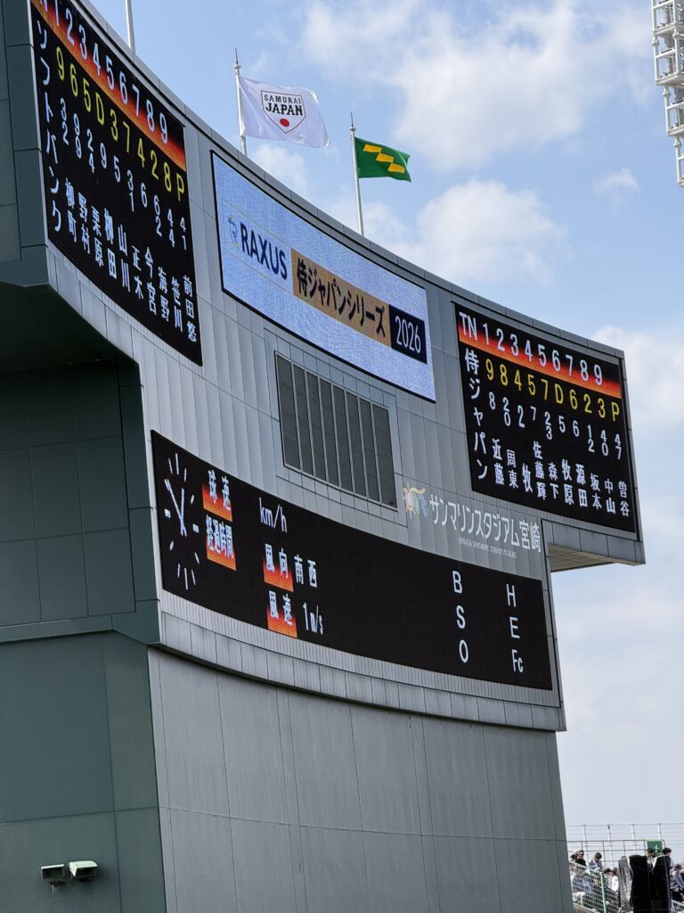 本日(2026年2月22日)、志布志から木花まで日南線に乗車し、宮崎サンマリンスタジアムで開催された「ラグザス 侍ジャパンシリーズ2026 宮崎」を観戦してきました。