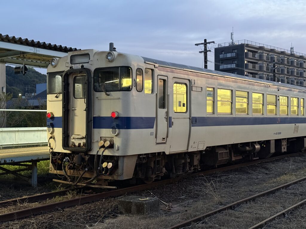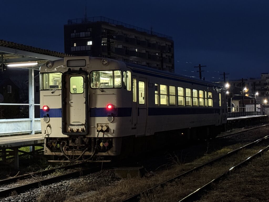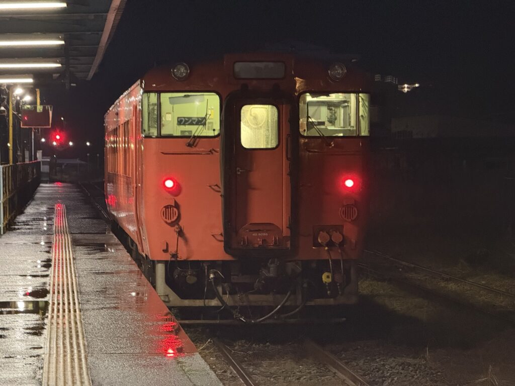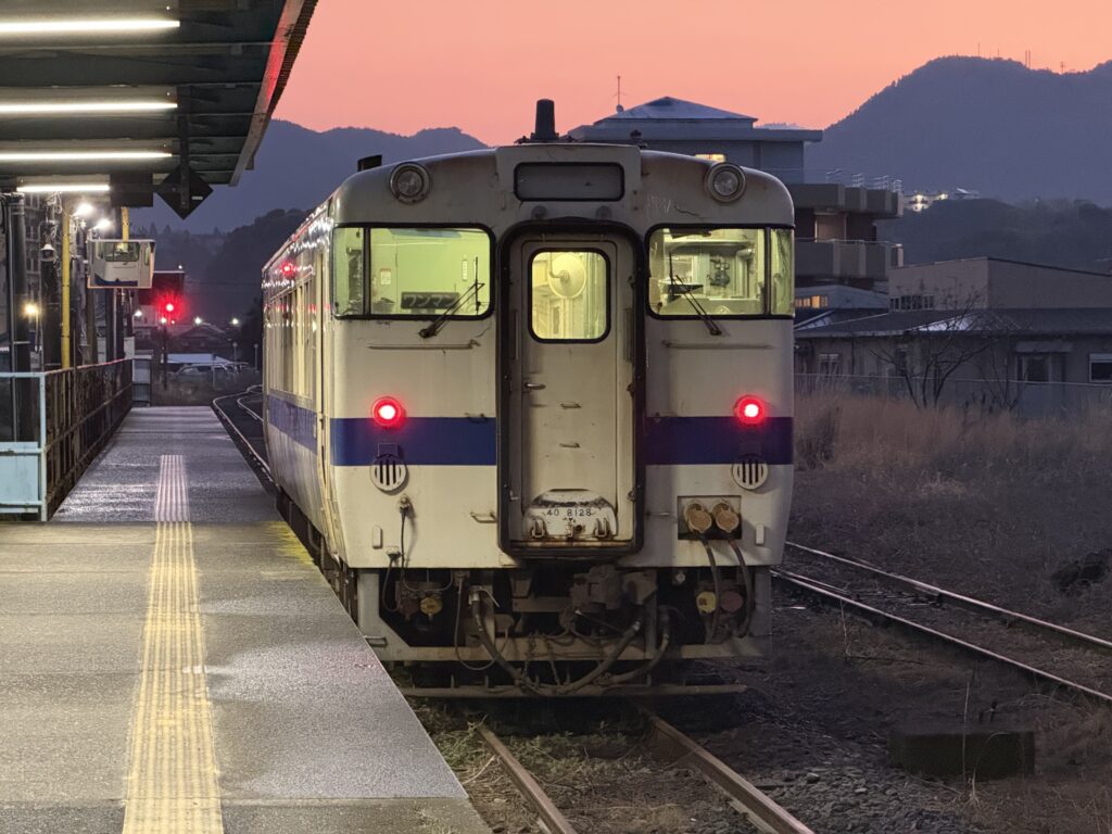 始発列車に入ったのはキハ40 8069。運転台の窓にある塗装の傷?が目印です。