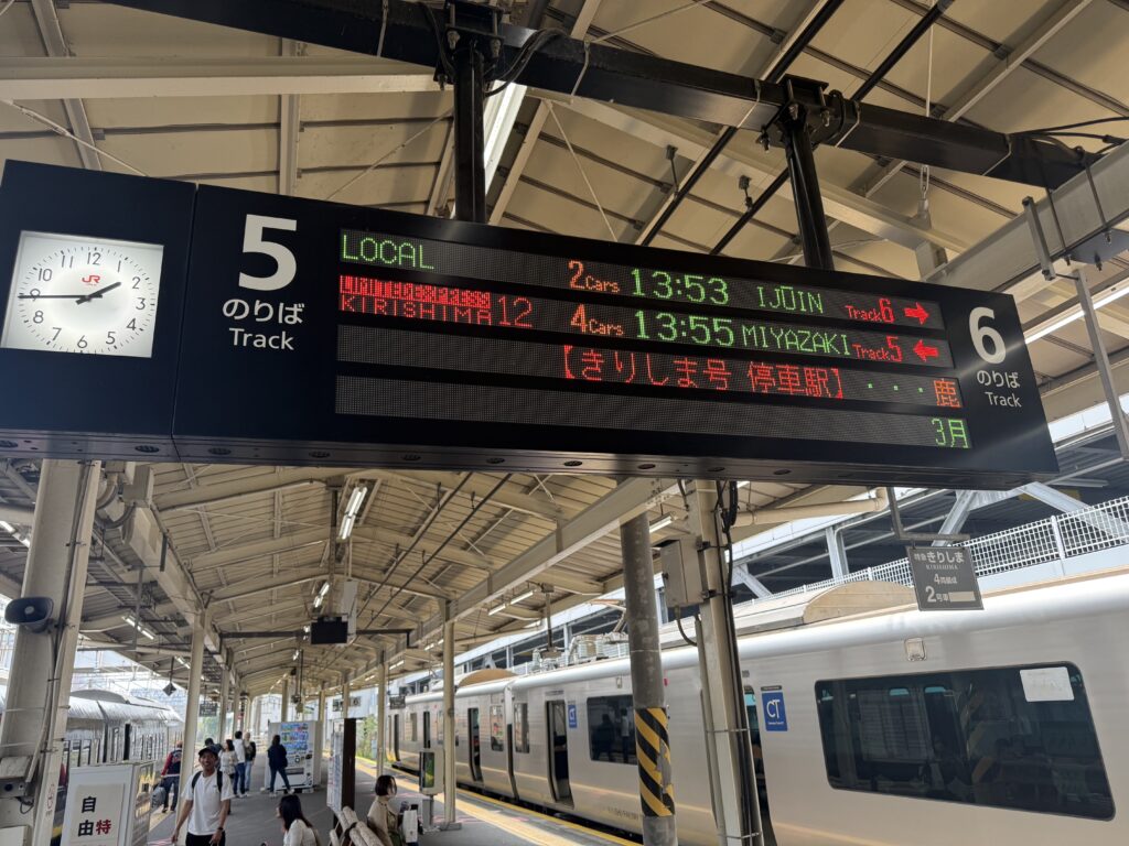 今回は、行きは普通列車、帰りは特急きりしまのグリーン席という組み合わせでの移動です。